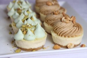 These mini desserts are so easy to create with our many toppings. Provide a new and unique experience with our buttercreams to top cheesecakes. Peanut Butter and Pistachio Decocrèmes Buttercrème are used to finish these tiny treats that are sure to fly off the shelf.