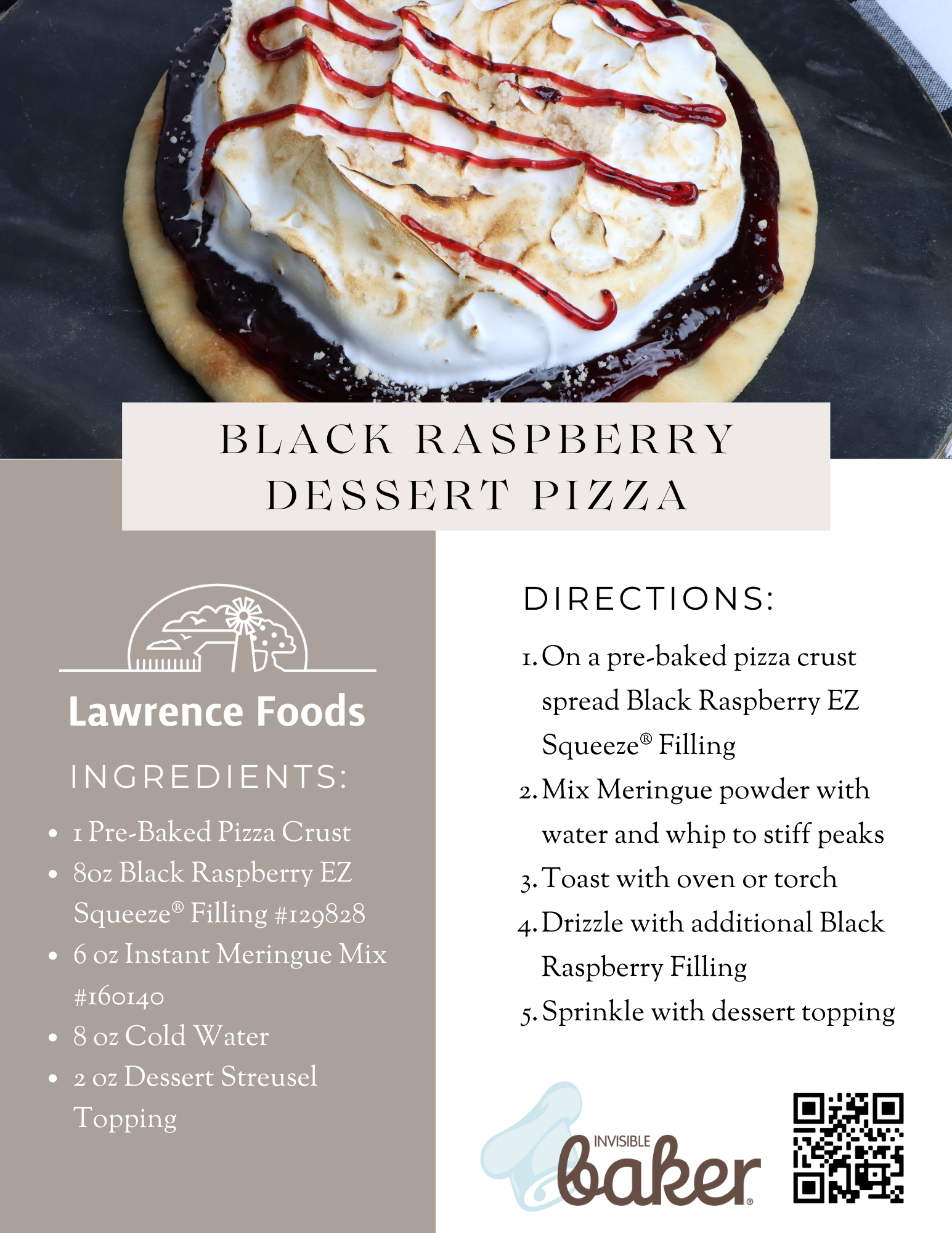 A toasty meringue tops this delicate black raspberry filling to become a fluffy fruity pizza that is more than just a sweet treat. Lawrence Foods Instant Meringue Powder is a just add water mix that spreads and toasts to instant perfection every time.