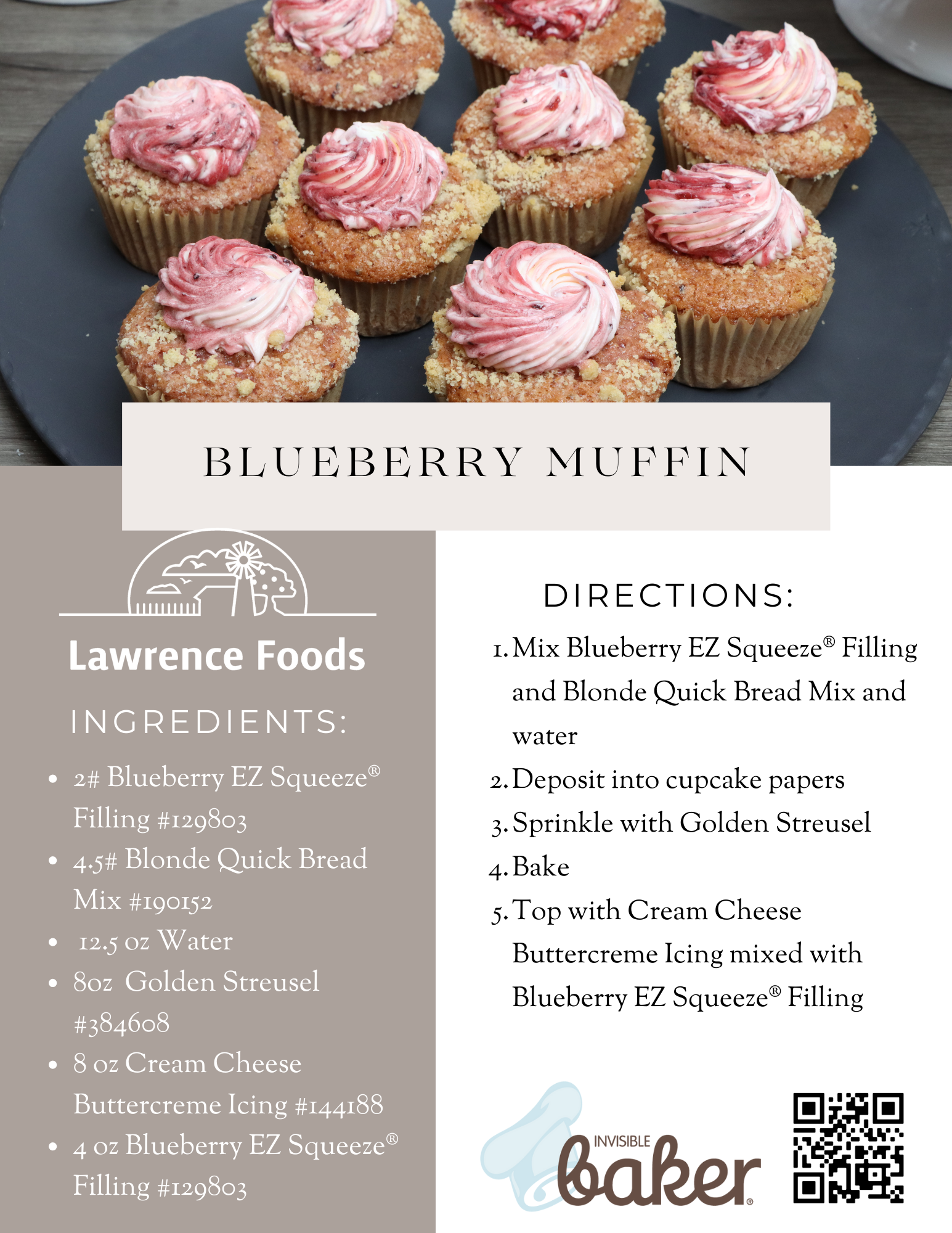 Muffins are the best way to enjoy cake for breakfast. Lawrence Foods Blonde Quick Bread Mix and Blueberry Filling easily become the makings of a moist, delicious, and fruity muffin. These muffins are topped with streusel and cream cheese buttercrème to complete the delectable quick breads.