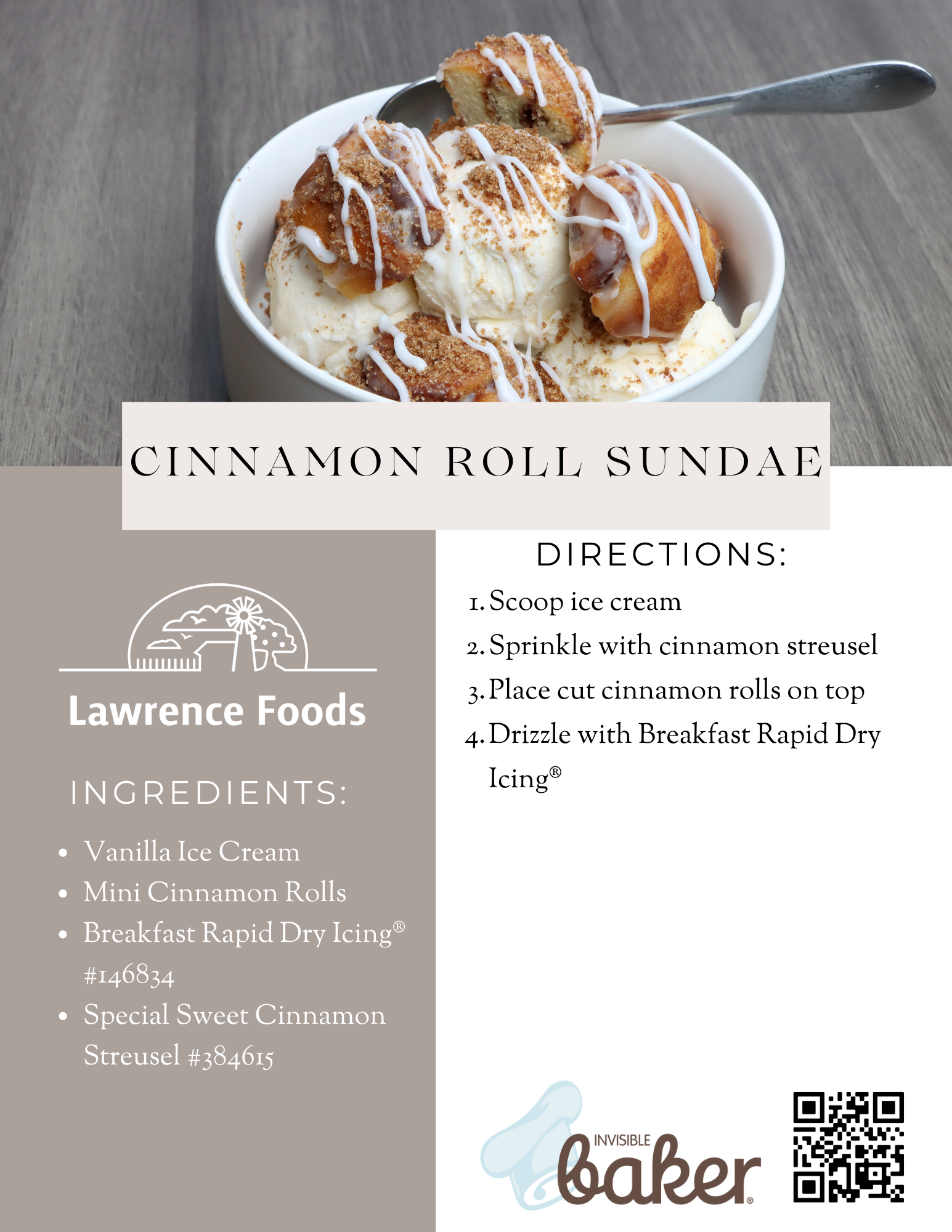 Mini cinnamon rolls and with Lawrence Foods Special Sweet Cinnamon Streusel mixes the sweet baked goods from breakfast with the creamy dessert. Drizzling this sundae with Breakfast Rapid Dry finishes it off perfectly. Who says you can’t have dessert for breakfast?