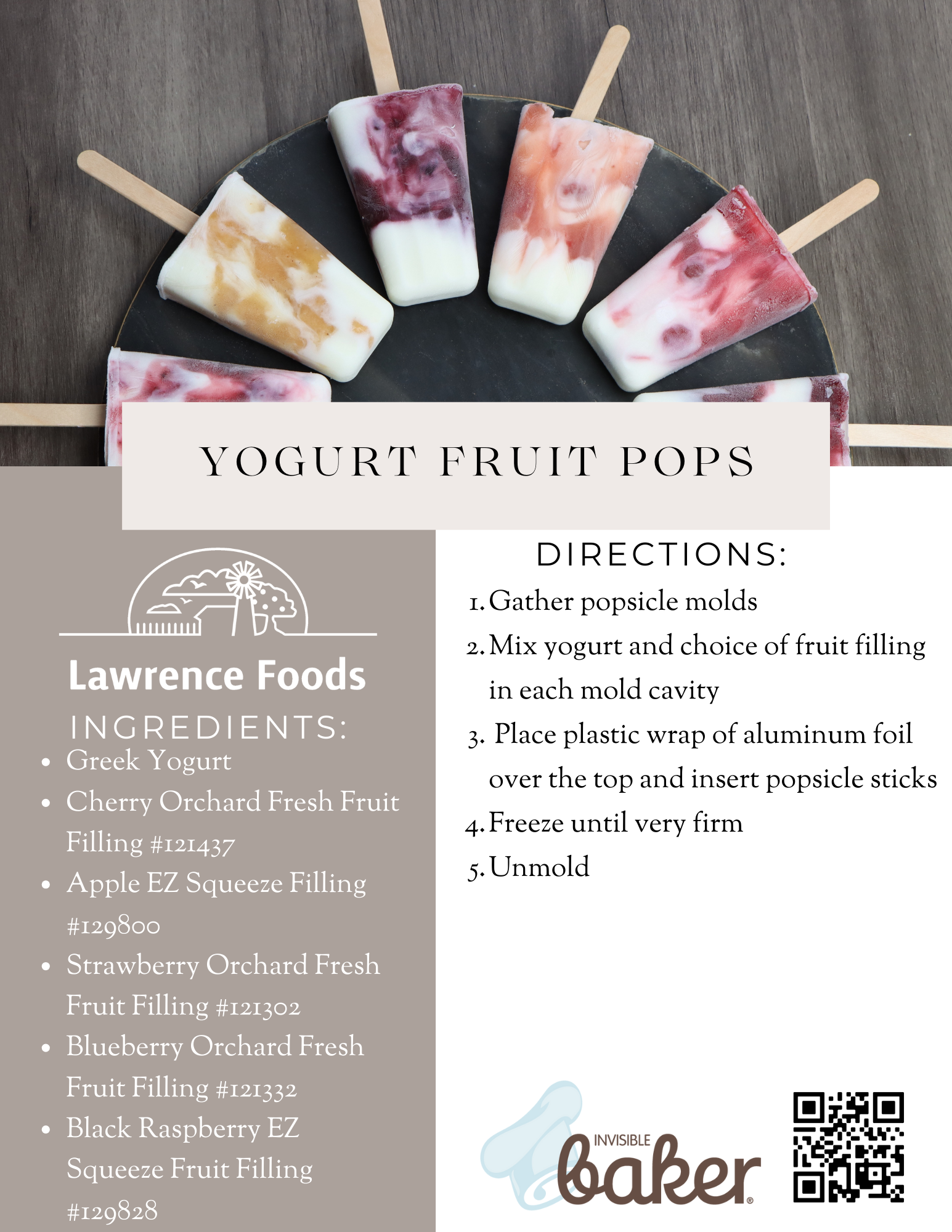 A tasty treat that can be made with only two ingredients couldn’t be easier! Lawrence Foods Fruit fillings and greek yogurt make a delicious snack for anytime. Just mix, freeze and unmold for a simple frozen pop.