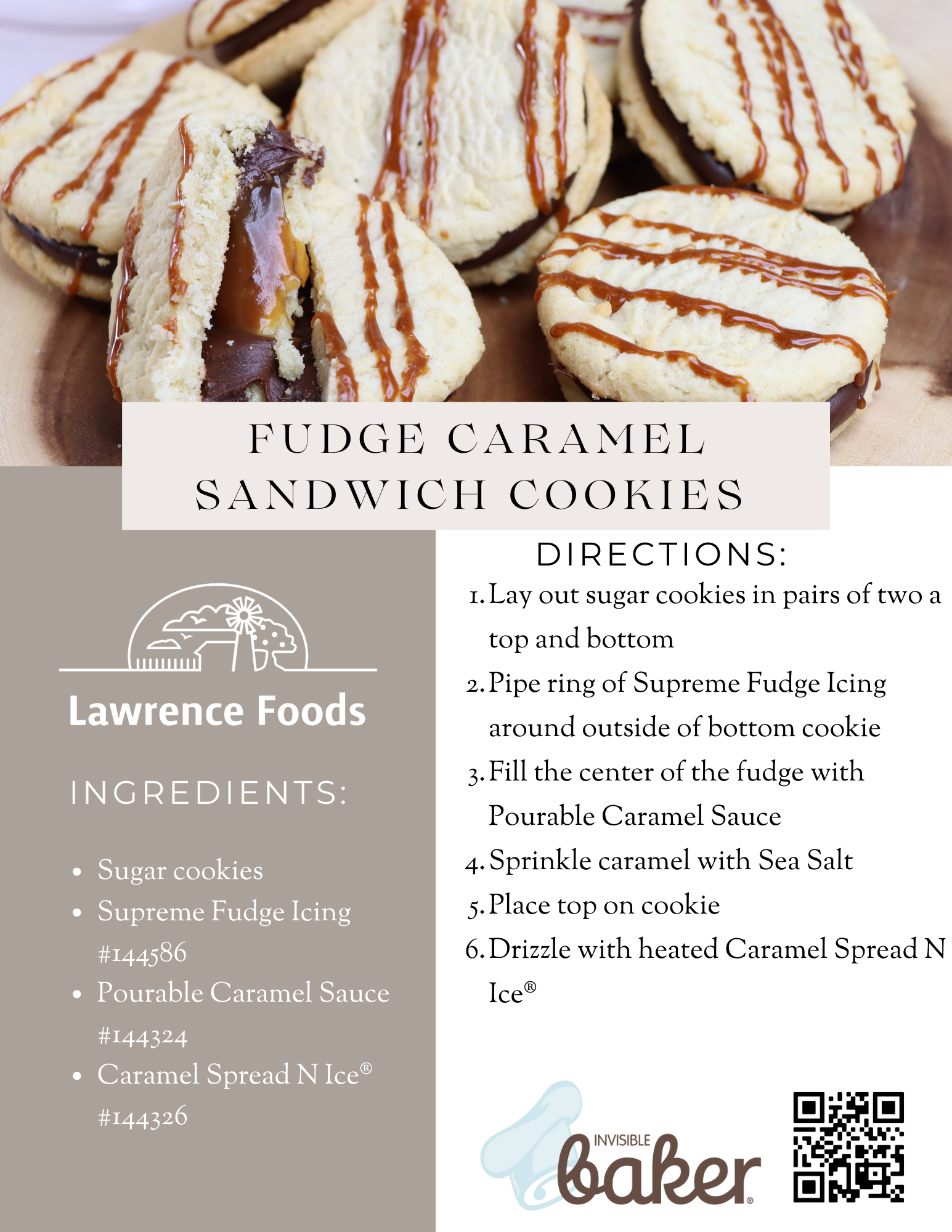 Caramel and chocolate blend nicely in this easy to prepare cookie sandwich. Lawrence Foods Supreme Fudge and Pourable Caramel Sauce provide the creamy texture to this simple creation.