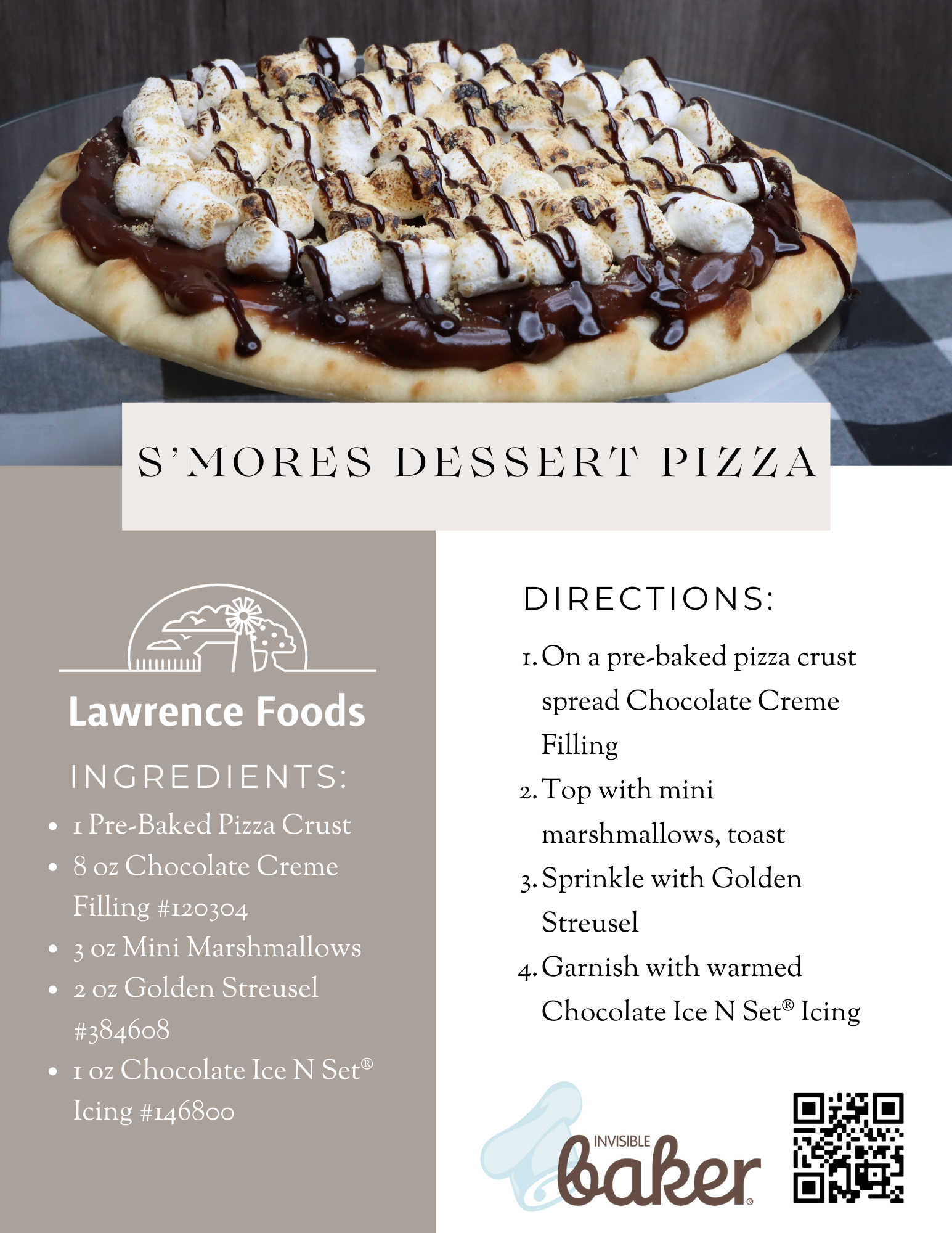 Grab a slice of this campfire classic! Lawrence Foods Chocolate Creme filling adds a creamy twist to this simple dessert. Warm melted marshmallow and crisp Golden Streusel topping finishes this instant favorite.